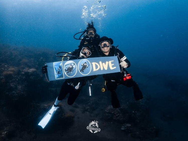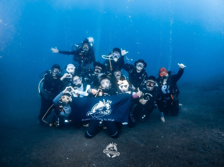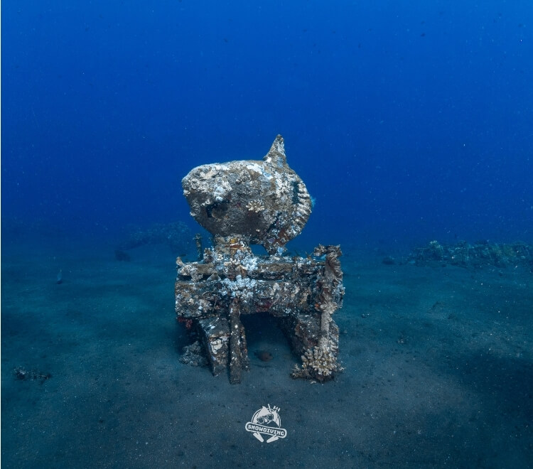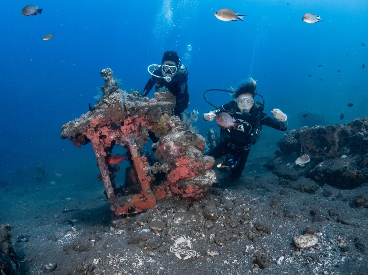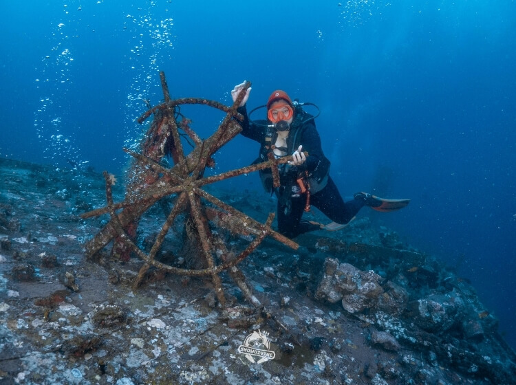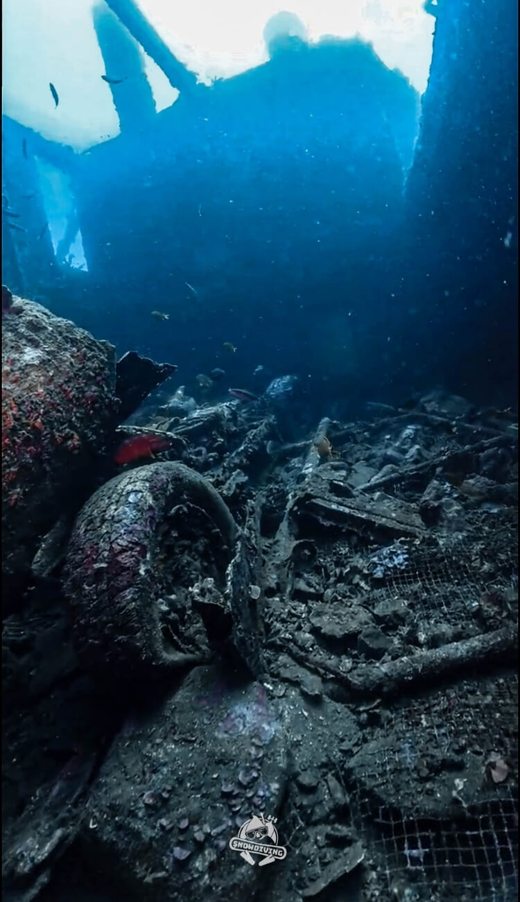 歡樂的時光總是過得特別快,咻一下就到了最後一潛,這艘沈船也是小編指定要去的,雖說沒有自由號那麼大艘,但裡面的可是有一輛吉普車跟船艙內的佛像等等,場景很好拍,船艙也都滿大很好鑽,可惜能見度沒有很好,深度也滿深的落在 30-40 米左右,也不能待太久,逛一下船艙就要回程了;那恰恰好有 2 位學生在這潛剛好 100 潛,直接在水裡幫他們慶祝!~