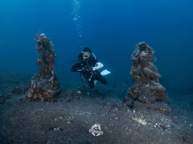 位於土蘭奔灣中央區域(沈船在左邊,斷層在右邊),一入水後是個 2~15米 深的緩斜坡,有很多硬珊瑚、大型海棉、海扇等,當地人將神像、神龕、各種生物的雕像投入海中,看起來宛如水中神廟,生態非常豐富,在回程中淺層處大約2米深左右,遍地滿滿的軟珊瑚海葵及珊瑚礁魚類,再配上太陽灑下來的神聖之光,哇噻~真的是無可匹敵的美景就在眼前無法忘懷!
