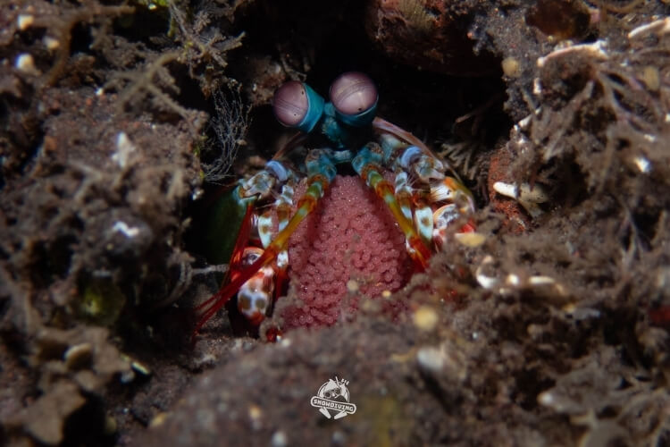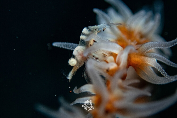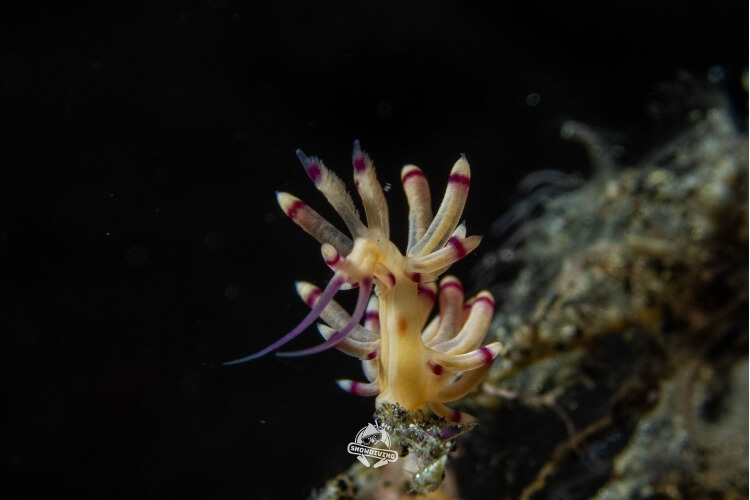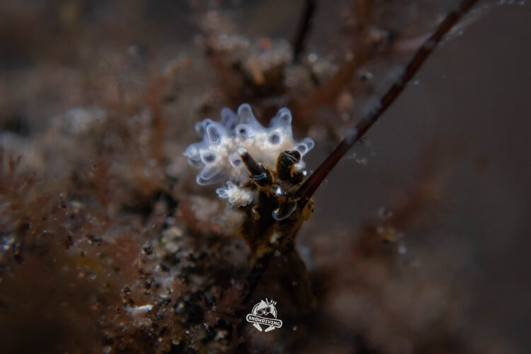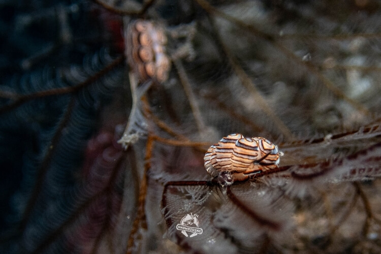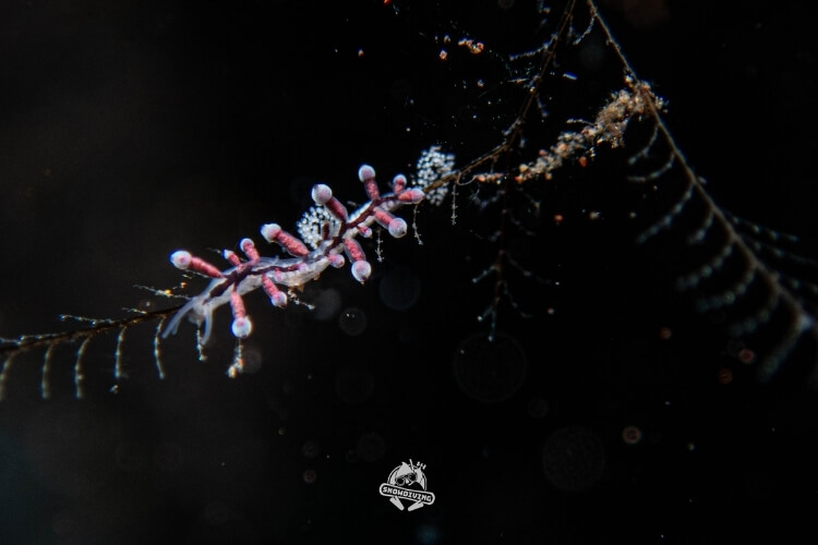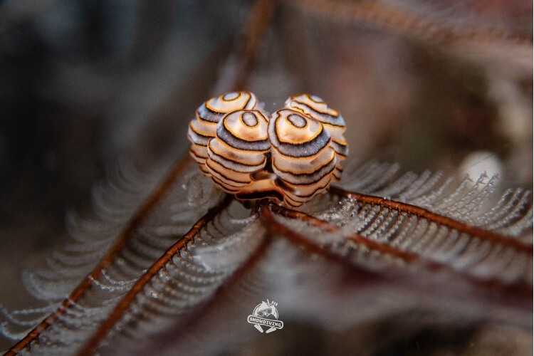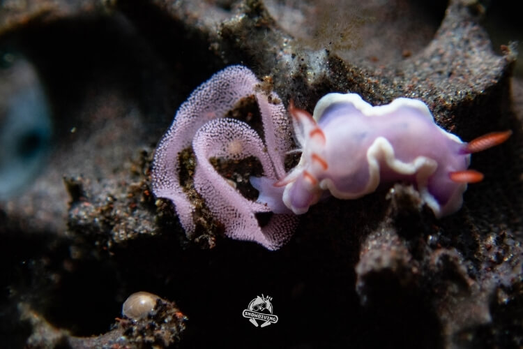 萬眾矚目的甜甜圈海蛞蝓就在這個潛點,長約1.5公分,生活在羽毛狀的羽螅上;一下潛直奔主角,不到5分鐘後就看到了本尊,整個被萌翻,外型一小圈一小圈的,難怪叫甜甜圈海蛞蝓,拍著拍著都餓了 ≥≤ 也十分幸運的遇到了流……所以在拍攝過程中挺艱辛的,除了甜甜圈海蛞蝓還有其他的小小海蛞蝓,大家也都拍得不亦樂乎。