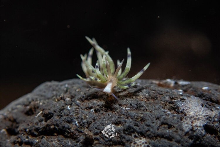 本趟最大重點就是那些小巧可愛的海蛞蝓們!網路上的照片總是幫他們拍的如此美麗,這次直接來到現場就想親眼目睹是否真如照片那樣注目。當下潛時,看到的是一望無際的荒蕪,搭配因火山關係而呈現黑色細沙粒的地質,一整個很疑惑?這….真的有海蛞蝓?只見導潛拿著小吹嘴、細竹籤,在地上東翻翻西找找,過沒多久就被叫去,只見米粒大小的海蛞蝓就在石頭上,一整個很興奮開始拍,剛拍完又被叫去拍另一隻,完全沒有重複的種類一直出現在面前,真的覺得太神奇了。