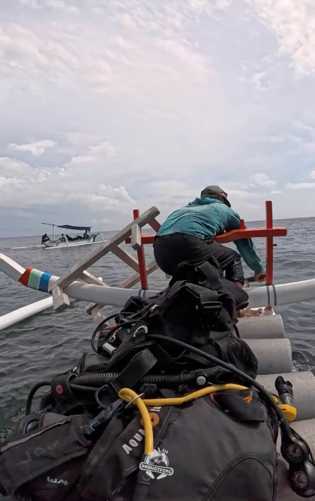 (Banca 或 outrigger),它的名稱來自於其獨特的構造:船體細長,兩側裝有向外伸出的長竹竿或木頭支架,看起來就像螃蟹的腳一樣,遇到風浪時能提供額外的浮力,有效平衡船身,防止翻覆,確保在海上行駛時更平穩、更安全。但一次只能載2-5位,容納空間較小,相對沒那麼舒服;船程5分鐘而已,到潛點後,導潛會先下去,船長會把裝備遞給導潛,戴好面鏡穿好蛙鞋,就可以慢慢下去找導潛幫你穿裝備。
