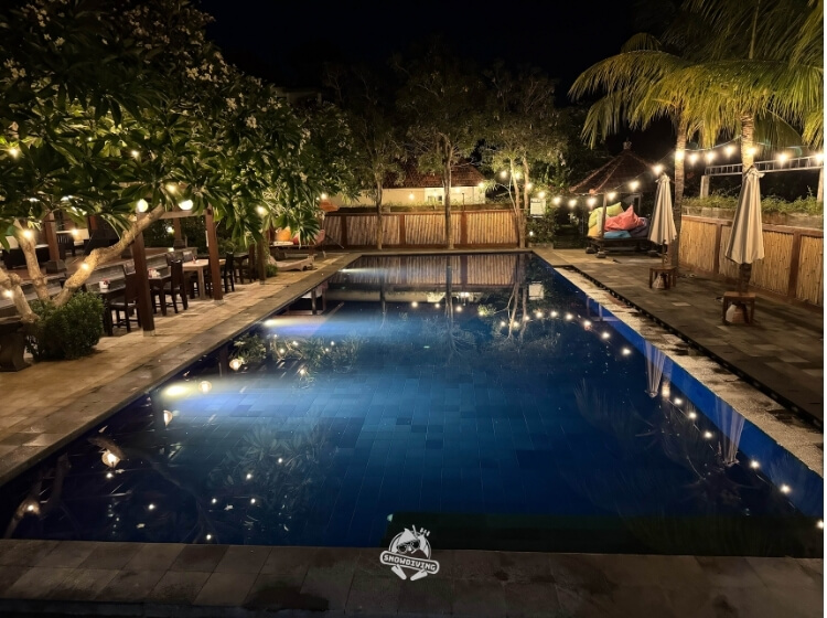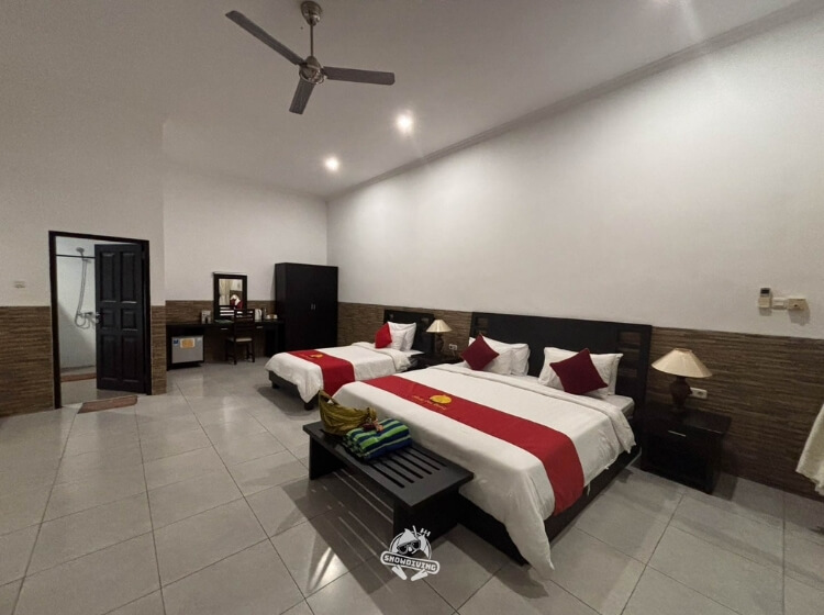 是許多人會選擇入住的潛水度假村,房間跟床超級大跟舒服、還有浴缸跟自己的小庭院,想單獨放自己的裝備也很方便,空間非常的足夠,公共空間還有2大寬敞的泳池跟草皮,以及無敵舒適的躺椅和涼亭,自助吧的餐食也非常符合亞洲人的口味,整體的住宿環境真的是一級棒。